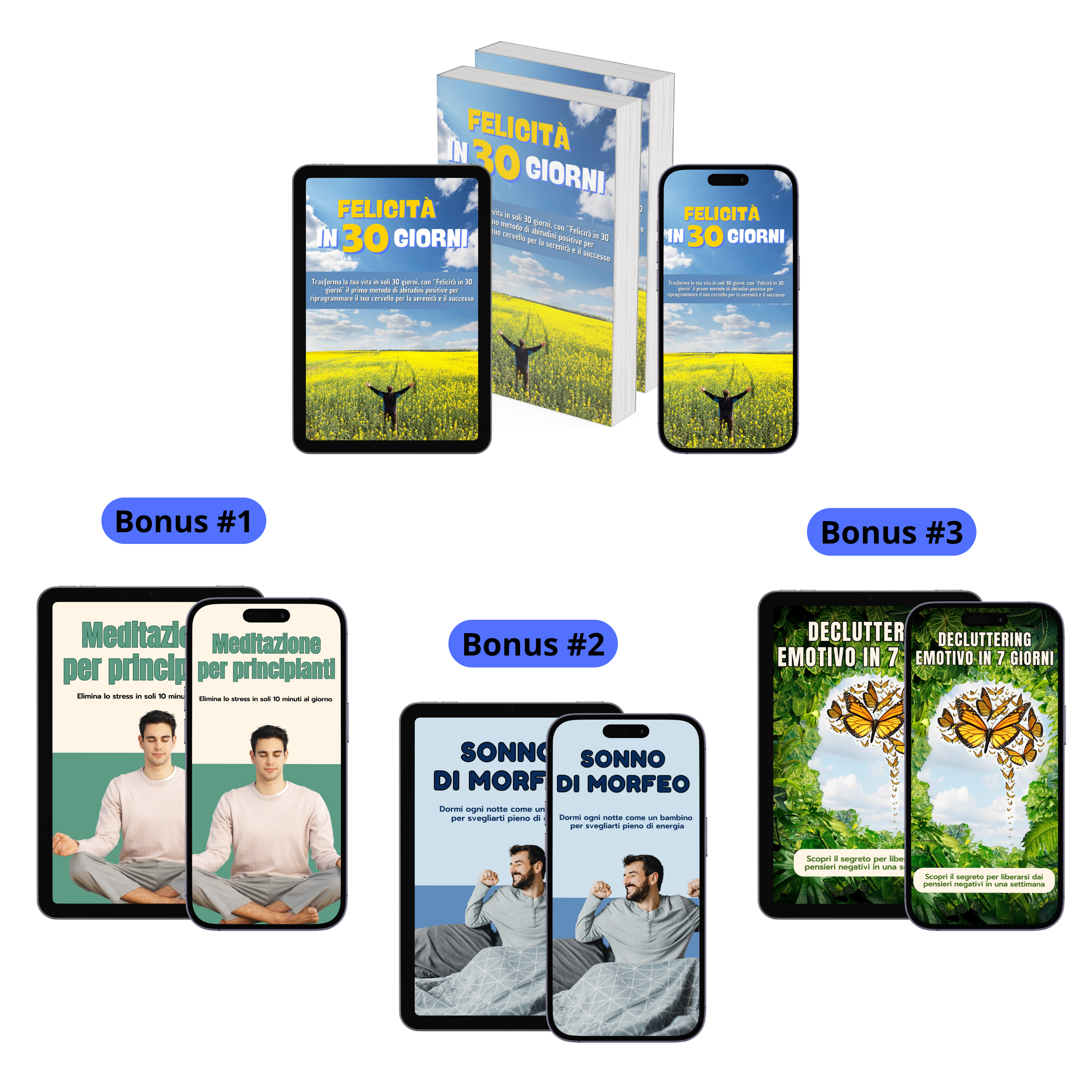 Trasforma la tua vita in soli 30 giorni, con “FELICITA’ IN 30 GIORNI” il primo metodo di abitudini positive per riprogrammare il tuo cervello per la serenità e il successo.
